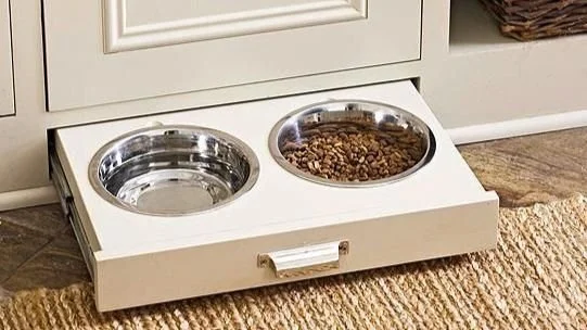 Consider the space beneath the kick boards in your kitchen or utility, these are often void space and can be turned into neat pull out drawers that can hold food bowls or even a small bed (depending on depth) - they space saving and great for those who want to avoid floor clutter!